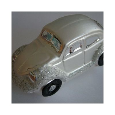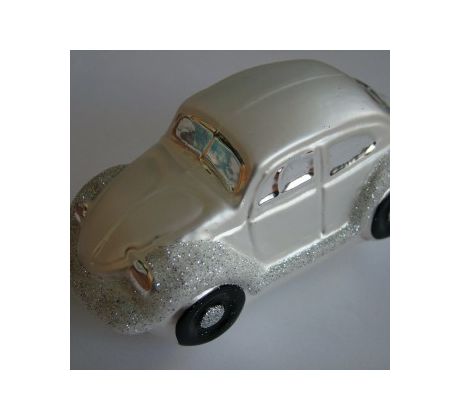 Sklenená vianočná ozdoba, forma, auto Chrobák, mat, biely, dekor, veľkosť 11x5 cm. U varianty balenia G1/1 ks je cena vrátane darčekovej krabičky. Foto ilustračné.