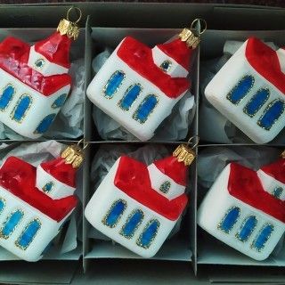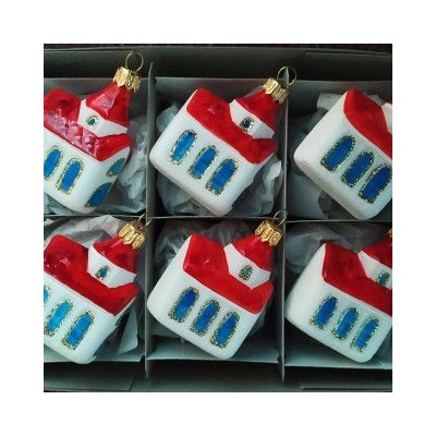 Sklenená vianočná ozdoba, forma, kaplnka, biela, farebný dekor. Foto ilustračné.