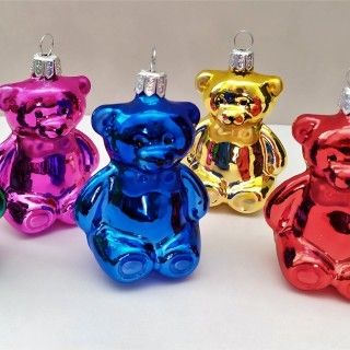 Sklenená vianočná ozdoba, forma, medvedík malý, lesk, farba ass, veľkosť 8x5,5 cm. Foto ilustračné. V krabici sortiment farieb: červená, modrá, zlatá, zelená, ružová, fialová.