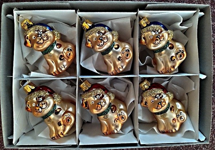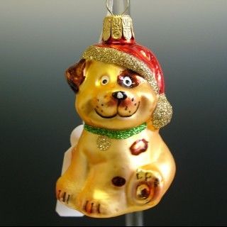 Sklenená vianočná ozdoba, forma, pes s čapicou, mat, zlatá/204, dekor, v balení pes s čapicou v 2 farbách (červená+modrá),veľkosť 7x5 cm, foto ilustračné. Balenie 6 ks.