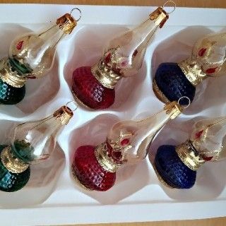 Sklenená vianočná ozdoba, forma, petrolejka malá, priehľadná, sortiment farieb červené, modré a zelené, lesk, dekor, veľkosť 8x4 cm. Foto ilustračné. Balenie 6 ks.