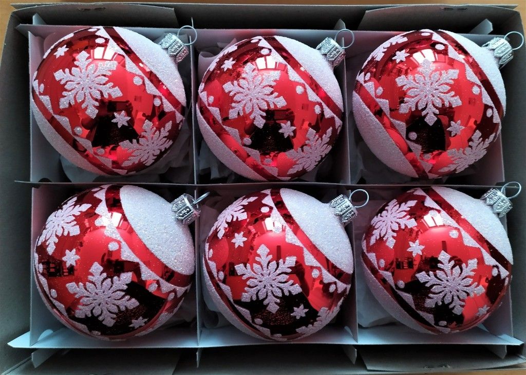 Sklenená vianočná ozdoba v tvare gule, hladká, červená, lesk, biely dekor, foto ilustračné, viac veľkostí