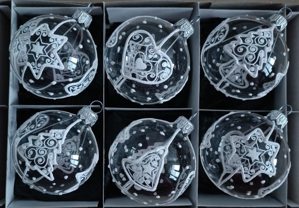 Sklenená vianočná ozdoba v tvare gule, hladká, číra, lesk, biely plastický dekor. Viac veľkostí. Foto ilustračné.