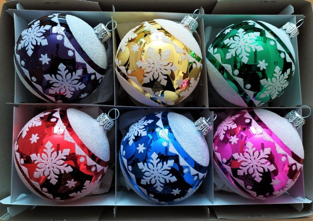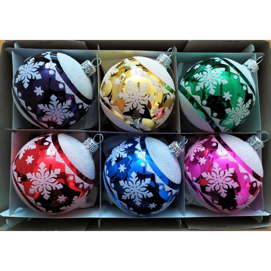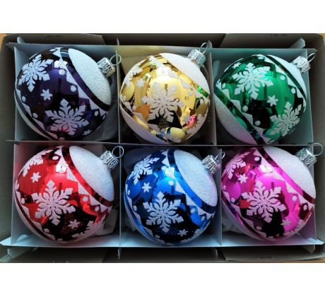 Sklenená vianočná ozdoba v tvare gule, hladká, farba ass, lesk, biely dekor, foto ilustračné, viac veľkostí. V krabici sortiment farieb: červená, modrá, žltá, zelená, ružová, fialová.