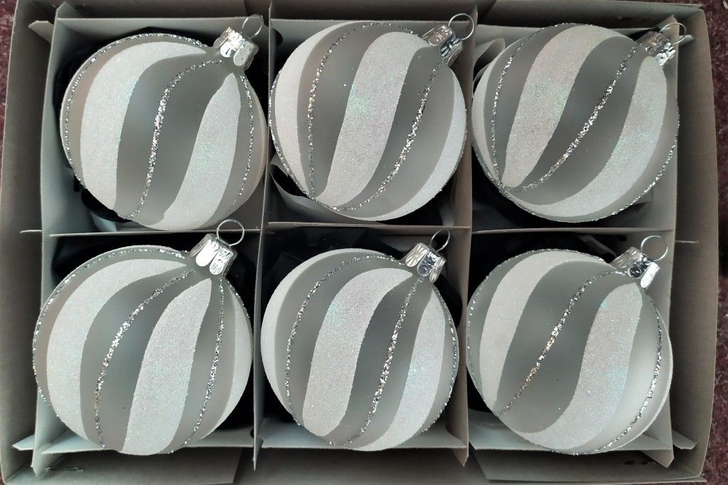 Sklenená vianočná ozdoba v tvare gule, hladká, priehľadná, biela, mat, dekor, viac veľkostí. Foto ilustračné