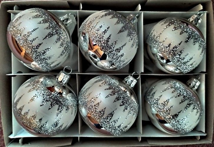 Sklenená vianočná ozdoba v tvare gule, hladká, striebra, stredom strieborný sypaný dekor, viac veľkostí. Foto ilustračné