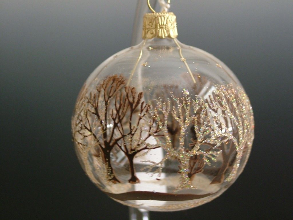 Sklenená vianočná ozdoba v tvare gule, hladká, číra, lesk, hnedozlatý dekor stromov. Foto ilustračné.