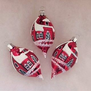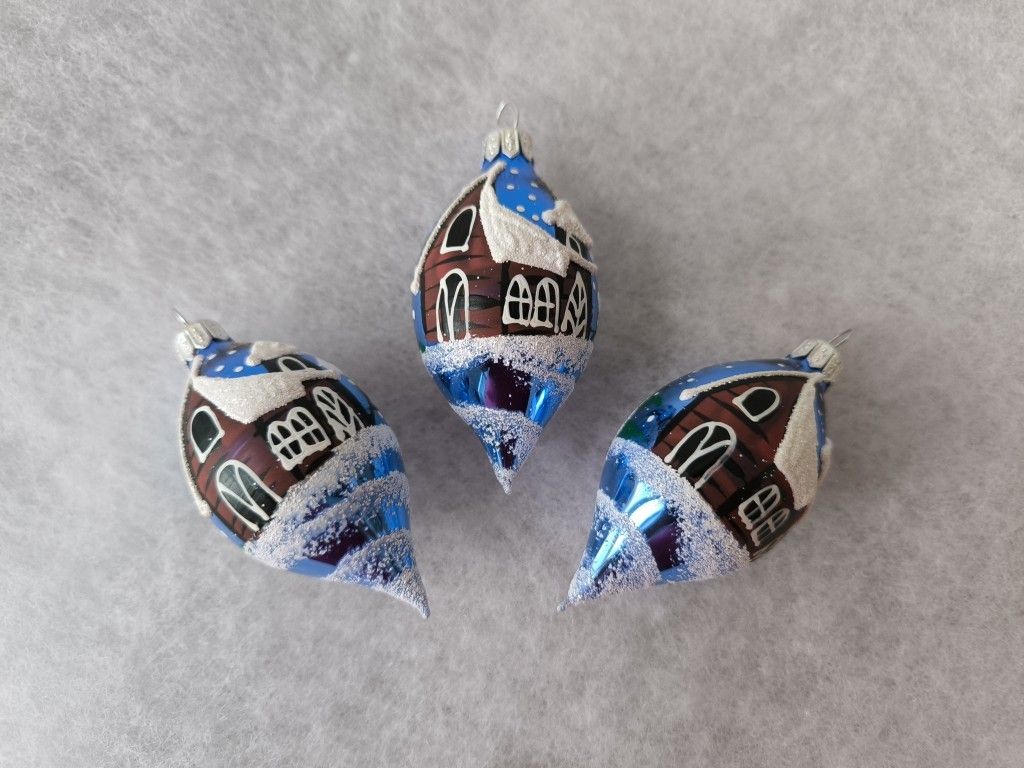 Sklenená vianočná ozdoba, oliva, červená a modrá varianta, lesk, ručne maľovaný plastický dekor, zimný motív. Foto ilustrační. Velikost 8 x 4 cm.