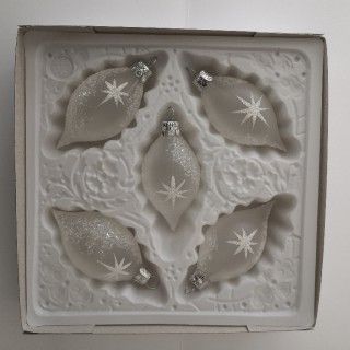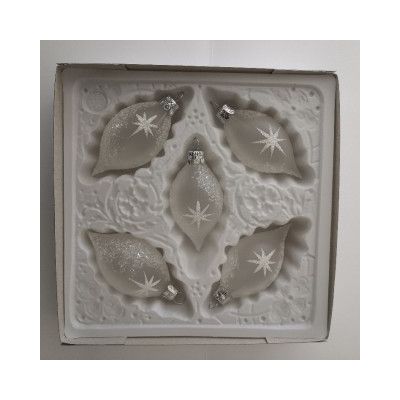 Sklenená vianočná ozdoba v tvare olivy, hladká, priehľadná, biela, biely dekor hviezd, veľkosť 8x4 cm, foto ilustračné.Balenie 5ks.