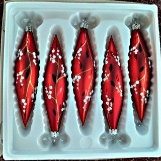 Sklenená vianočná ozdoba v tvare rakety, hladká, červená, mat, maľovaný vetvičkový dekor, veľkosť 14x3 cm, foto ilustračné. Balenie 5 ks.
