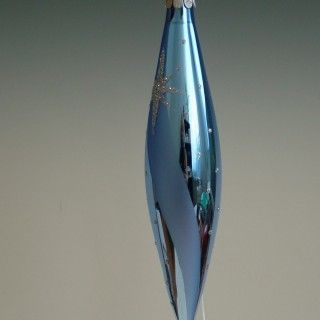 Sklenená vianočná ozdoba v tvare rakety, hladká, svetlo modrá, lesk, strieborný dekor hviezd, veľkosť 14x3 cm. Foto ilustračné. Balenie 5ks.