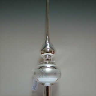 Sklenená vianočná ozdoba v tvare špicu, 1-guľa, hladká, strieborná, lesk, dekor, hviezdičky a bodky stredom gule, veľkosť gule 6 cm/dĺžka špicu 26 cm, foto ilustračné
