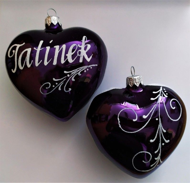 SRDCE VEĽKEJ TMAVE FIALOVEJ LESK, sklenená ozdoba, biely dekor
